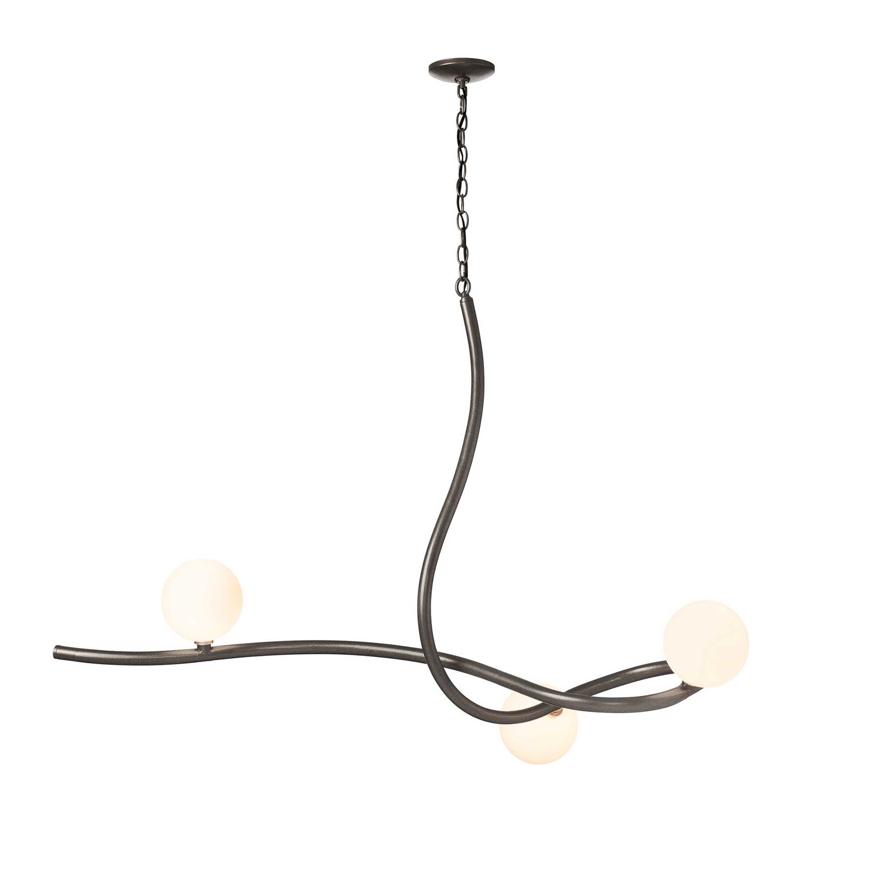 The Slide Pendant is a striking focal point in any space. Spanning nearly four feet in width, its flowing metal curves create a sense of movement and balance, elegantly supporting three opal glass globes. Both visually captivating and highly functional, the Slide Pendant brings a warm, graceful illumination to its surroundings.