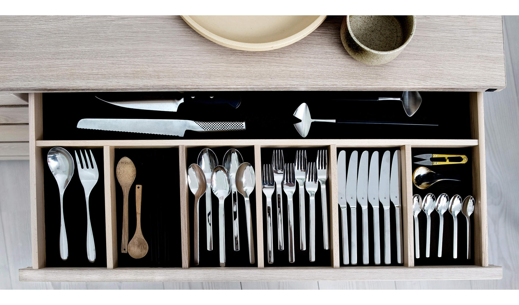 The Skovby #88 sideboard is equipped with drawers only, which is more practical than shelves. One top drawer has a tray with a heat-resistant surface, and the other is a cutlery drawer.