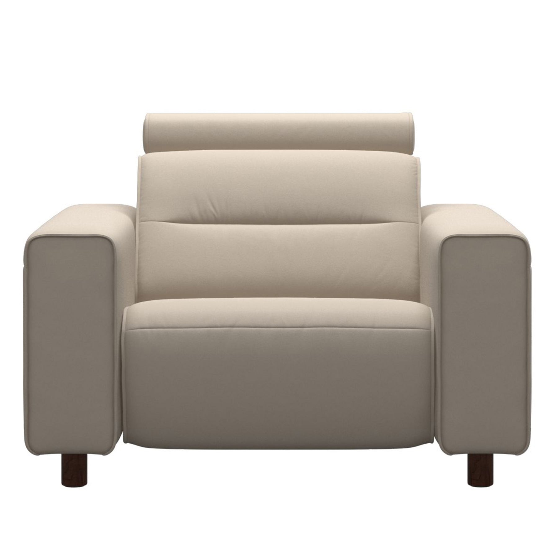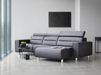 Sleek lines with a modern look give Stressless Emily an embracing appearance. The contemporary design of the soft enveloping cushions invites you to sit down and relax. All seat modules come with an adjustable headrest. Either with fixed seat-back or fitted with motors for personal adjustment of back and leg support. Choose between either steel or wood details on the armrest. The recliners Stressless Tokyo and Stressless View both couple up nicely with the Stressless Emily sofa.