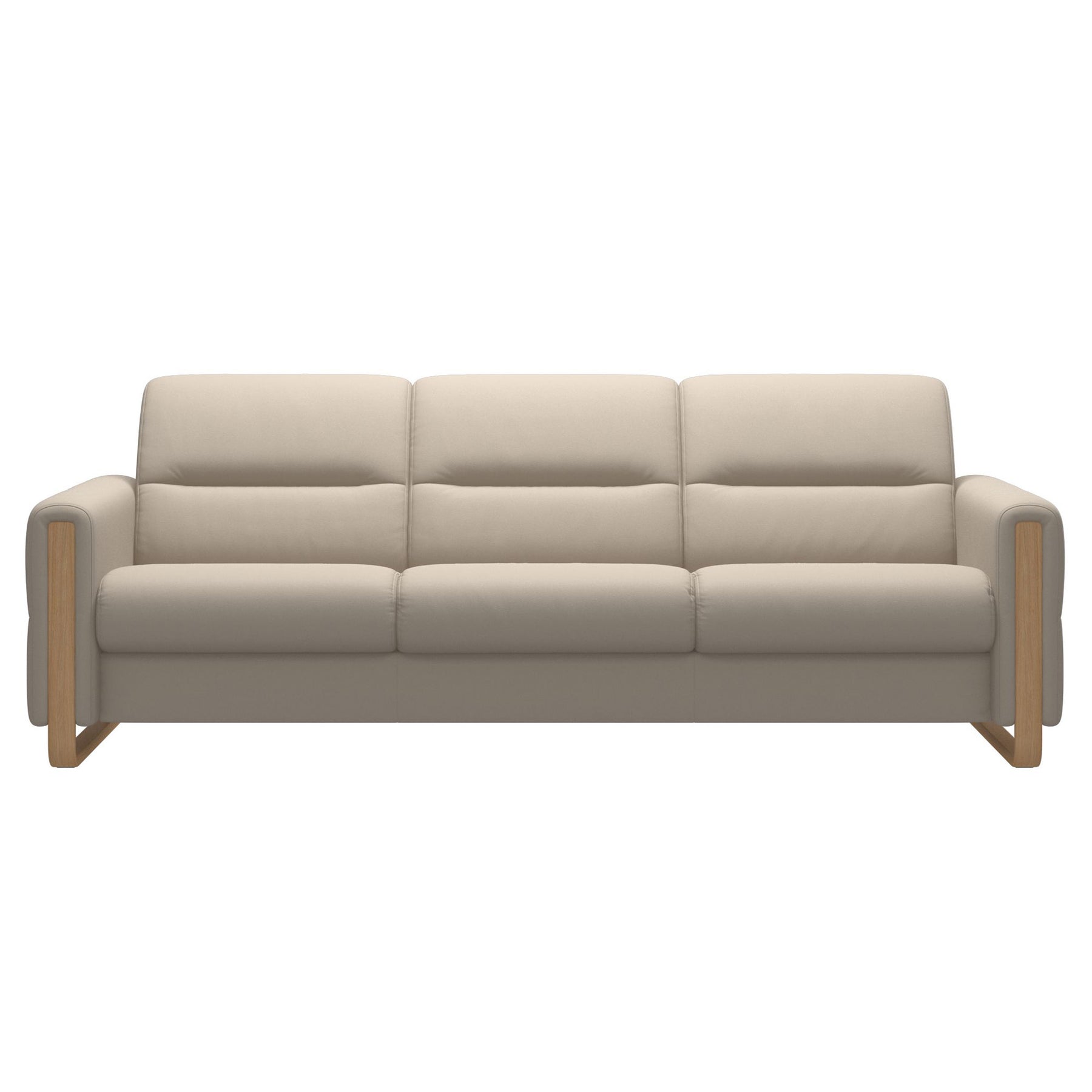 The Stressless Fiona 3 Seat Sofa Wood Arm boasts a modern, clean design with well-balanced proportions. Its classic, simple lines are highlighted by a sloping back and a fine horizontal stitch detail that adds a unique touch.
