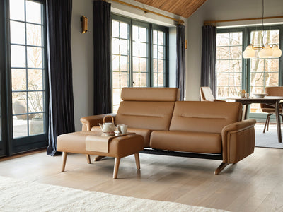 Stressless Stella 3 Seat Wood Arm (SW1) is a soft and contemporary modular sofa that responds to your movements. The Stressless® BalanceAdapt™ system allows the sofa to respond to your natural movements by adjusting the seat as you move. Recline, lean forward, lie down or put your feet up and feel how the soft and generous seat adapts to your position. When the occasion calls for just a regular sofa, simply lock the function to stop the seat from moving. Available with different armrests and seat widths, an optional corner, and a custom headrest, and footstool.